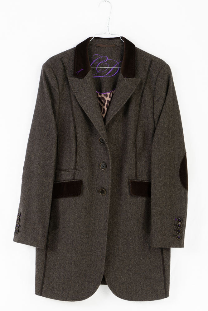 Material: Schurwoll-Angora-Mix Label: Clement Design Leichter Mantel Umlegekragen mit Kontrastbesatz Steigendes Revers Leichte Schulterpolster Fischgrät-Muster Drei-Knopfverschluss Paspelierte Pattentaschen Kontrast-Zierpaspeln Kontrast-Ellenbogen-Patches Zierknöpfe am Ärmelabschluss Taillierter Schnitt Gehschlitz auf der Rückseite Größe: 42 Ärmellänge: 64 cm Schulterbreite: 43 cm Rückenlänge: 85 cm Leichter Mantel aus Schurwoll-Angora-Mix von Clement Design mit tailliertem Schnitt und vielen liebevollen Details.