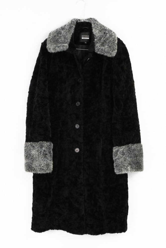 Material: Material-Mix in Fell-Optik Label: Steve Kettel Kontrastierter Umlegekragen Knopfleiste Zwei Eingrifftaschen Leicht taillierter Schnitt Kontrastkante am Ärmelanbschluss Gehschlitz auf der Rückseite Größe: 40 entspricht M Ärmellänge: 72 cm Schulterbreite: 45 cm Achsel zu Achsel: 53 cm Rückenlänge: 104 cm Sehr guter Zustand Vintage Mantel in Fell-Optik mit Kontrastkanten und leicht tailliertem Schnitt. Der perfekte Mantel für alle Liebhaber der 90er Jahre Mode um stilvoll und individuell durch die kühle Jahreszeit zu kommen.