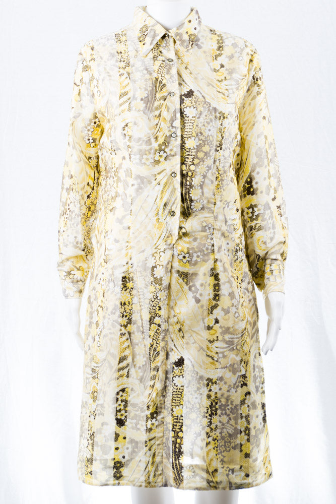 Material: Synthetik Label: PerleDeParis Rundhalssschnitt Umlegekragen Knopfleiste Lange Ärmel A-Linie 2-Knopf-Ärmelabschluss All Over Print Größe: 46 entspricht M (siehe Maße) Schulterbreite: 42 cm Brustweite: 94 cm Ärmellänge: 54 cm Gesamtlänge: 99 cm Sehr guter Zustand