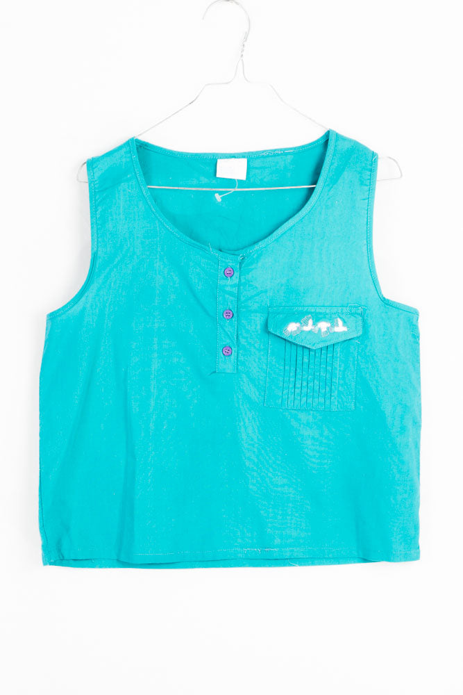 Material: Reine Baunmwolle Rundhalsausschnitt Halbe Knopfleiste Brusttasche mit eingelegten Falten Zierstickerei auf Brust Kurzer Schnitt Größe: 44/46 Rückenlänge: 52 cm Achsel zu Achsel: 50 cm Sehr guter Zustand 90er Jahre Vintage Shirt mit kurzem Schnitt und Zierstickerei auf der Brust.