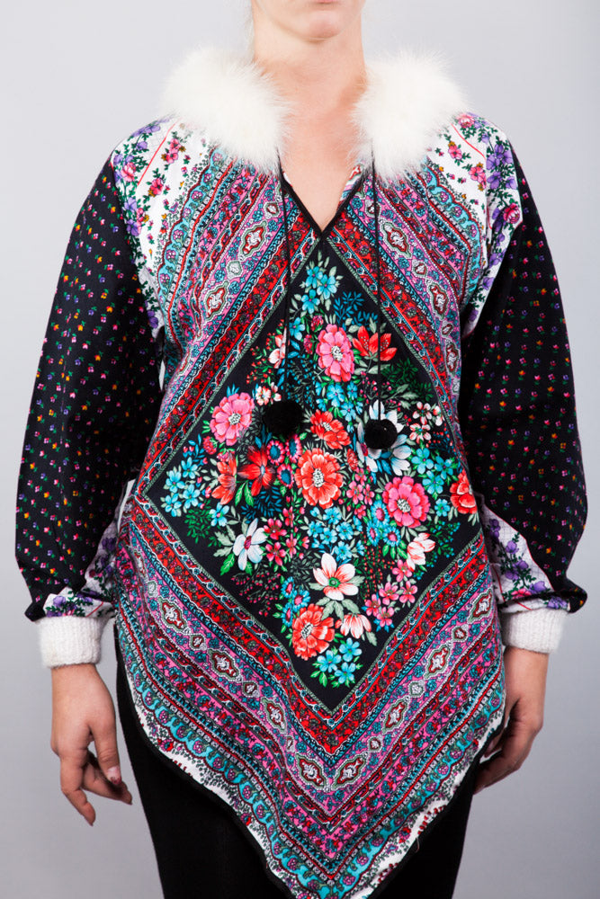 Material: keine Angabe / Baumwolle Handmade Rundhalsausschnitt mit eingesetztem V-Ausschnitt Abnehmbare Fell-Applikation am Ausschnitt Bindebommel auf der Vorderseite Dreiecksabschluss auf der Vorder- und Rückseite Gerippte Bündchen an den Ärmeln Größe: S-M Rückenlänge: 85 cm Schulterbreite: 46 cm Ärmellänge: 58 cm Model trägt regular größe 36/38 und ist 1.68 m groß. Sehr guter Vintage Zustand Bezaubernde Folklore Tunika mit buntem Ethno-Print. Die Vintage Langbluse ist ideal mit Leggings oder Strumpfhose kombiniert, fertig ist dein individuelles Outfit.