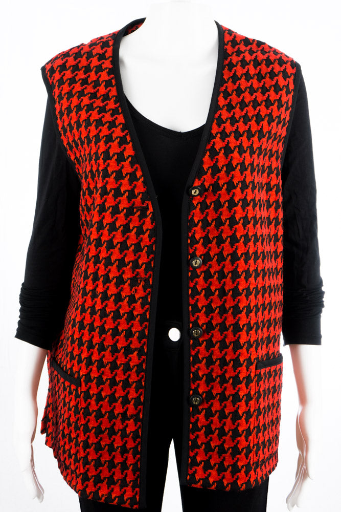 Material: Woll-Baumwoll-Mix Label: Sommermann Made in Germany V-Ausschnitt Knopfleiste Strukturierte Oberfläche Eingefasste Kanten Zwei aufgesetzte Taschen Größe: 44 entspricht L Rückenlänge: 67 cm Sehr guter Vintage Zustand Vintage Weste mit Hahnentritt Muster aus Woll-Baumwoll-Mix mit eingefassten Kanten.